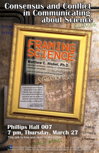 The talk starts at 7pm and will be in Phillips Hall 007. The event is sponsored by the Departments of English, Physics and Astronomy, the Earth Science Seminar Series, and the Office of Research and Sponsored Programs. A campus map is here.