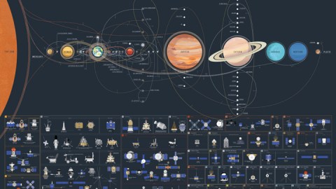 Each one is numbered here, and there’s a box below with the same number showing the craft that have traveled that route. There are direct routes, and there’s tons of gravitational slingshotting around celestial bodies that provides a craft momentum en route to a more distant destination like Pluto. In some cases, that involves involves multiple orbits around a nearby (relatively speaking) body — check out all the action around giant Jupiter, centrally located and capable of providing some powerful gravitational oomph.