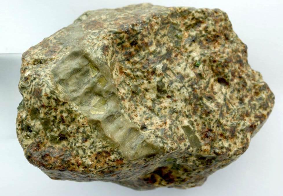 Erg Chech 002, or EC 002, was found in Adrar, Algeria last May in the nearly uninhabited Erg Chech region of the Sahara Desert. It was one of several chunks of meteorite discovered — together they weighed 32 kilograms (about 70 lbs). The Lunar and Planetary Institute describes EC 002 as being “relatively coarse grained, tan and beige appearance with sporadic larger green, yellow-green and less commonly yellow-brown crystals.”