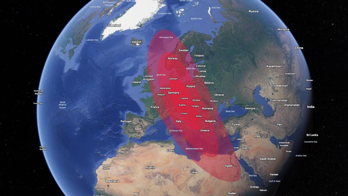 - Day 3, “June 30” — Images from the world’s four largest telescopes reveal the area in Europe that will be hit. Space-based infrared measurements narrow the object’s size to between 35 and 700 meters. This would pack a similar punch as a 1.2-megaton nuclear bomb.