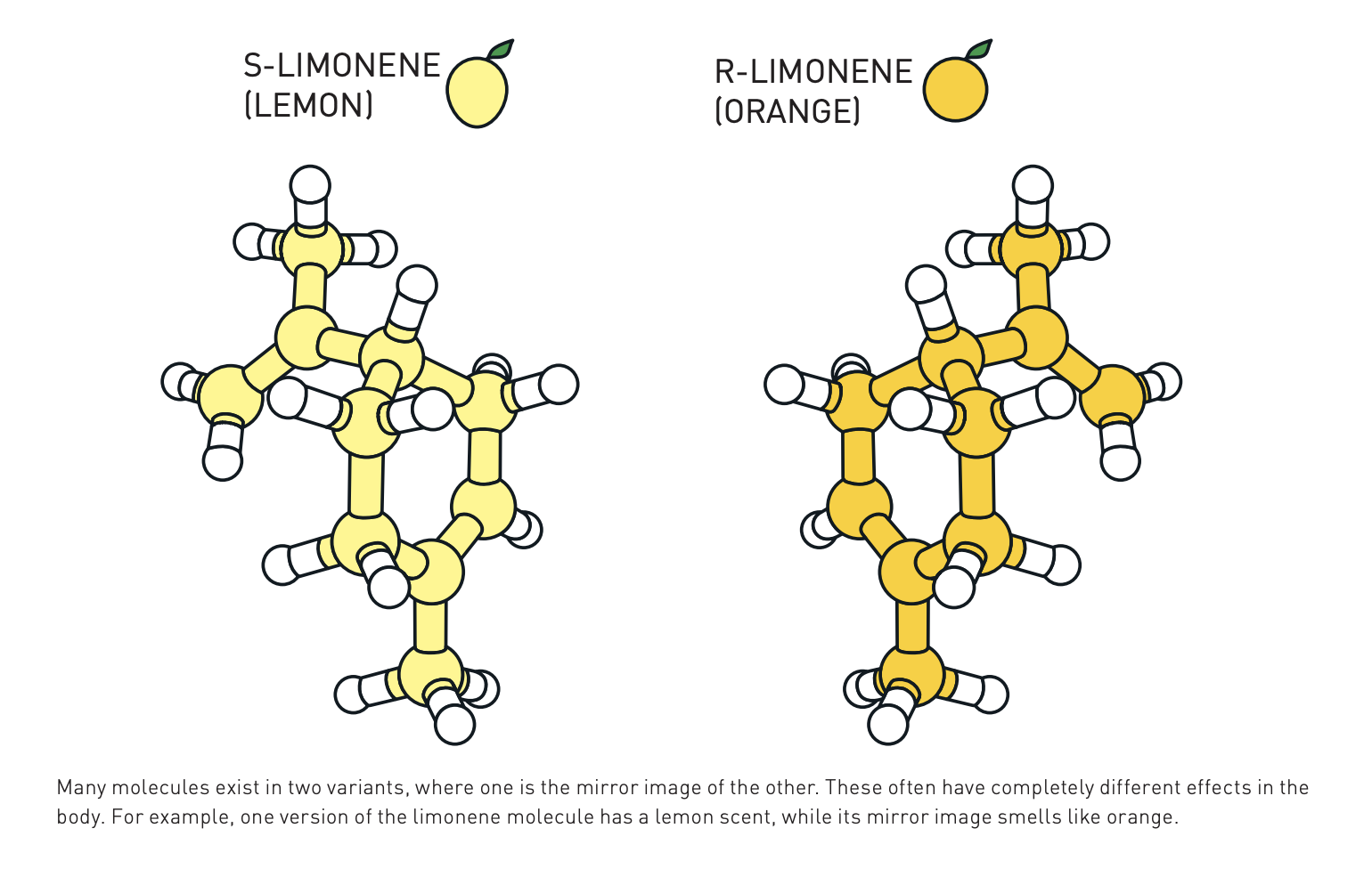 Here’s another example of chirality, found in the molecule limonene, whose mirror images produce the scent of either lemon or orange.