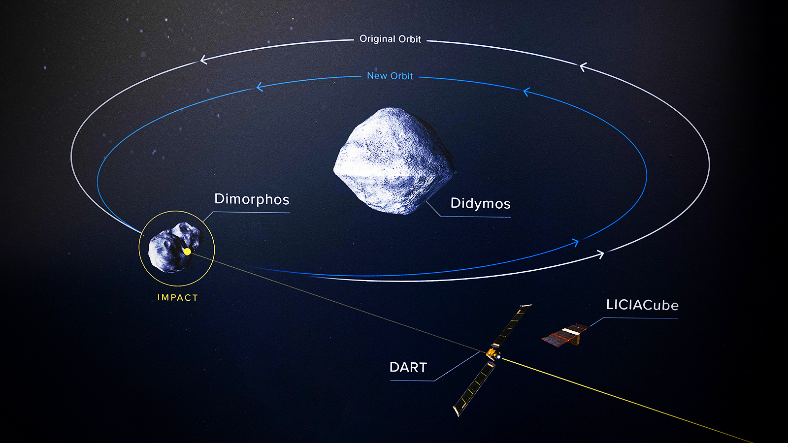 The point of the DART mission was to test whether it is possible to deflect an asteroid with a kinetic impact – by crashing something into it. NASA used the analogy of a golf cart hitting the side of an Egyptian pyramid to convey the relative difference in size between tiny DART and Dimorphos, the smaller of the two asteroids. Prior to the test, Dimorphos orbited Didymos in roughly 12 hours. NASA expects the impact to shorten Dimorphos’ orbit by about 1%, or roughly 10 minutes. Though small, if done far enough away from Earth, a nudge like this could potentially deflect a future asteroid headed towards Earth just enough to prevent an impact.