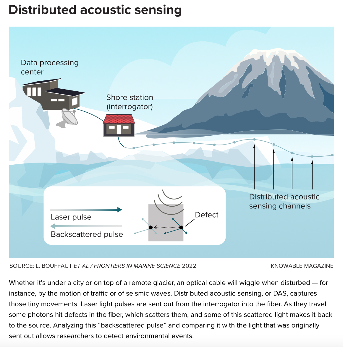 It’s like radar, but with light. Distributed acoustic sensing — DAS — picks up tremors from volcanoes, quaking ice and deep-sea faults, as well as traffic rumbles and whale calls.