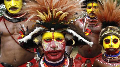 Huli wigmen from Lake Kopiago and Tari display their strikingly decorative woven wigs of human hair adorned with bird of paradise feathers during a singsing in Port Moresby, 14 August 2007. The Huli men weave their wigs from their own hair grown while living in isolation before they marry. The designs of the wigs and the patterns of their facial paint are indicative of a wigman’s tribe. (Photo credit: TORSION BLACKWOOD/AFP/Getty Images)