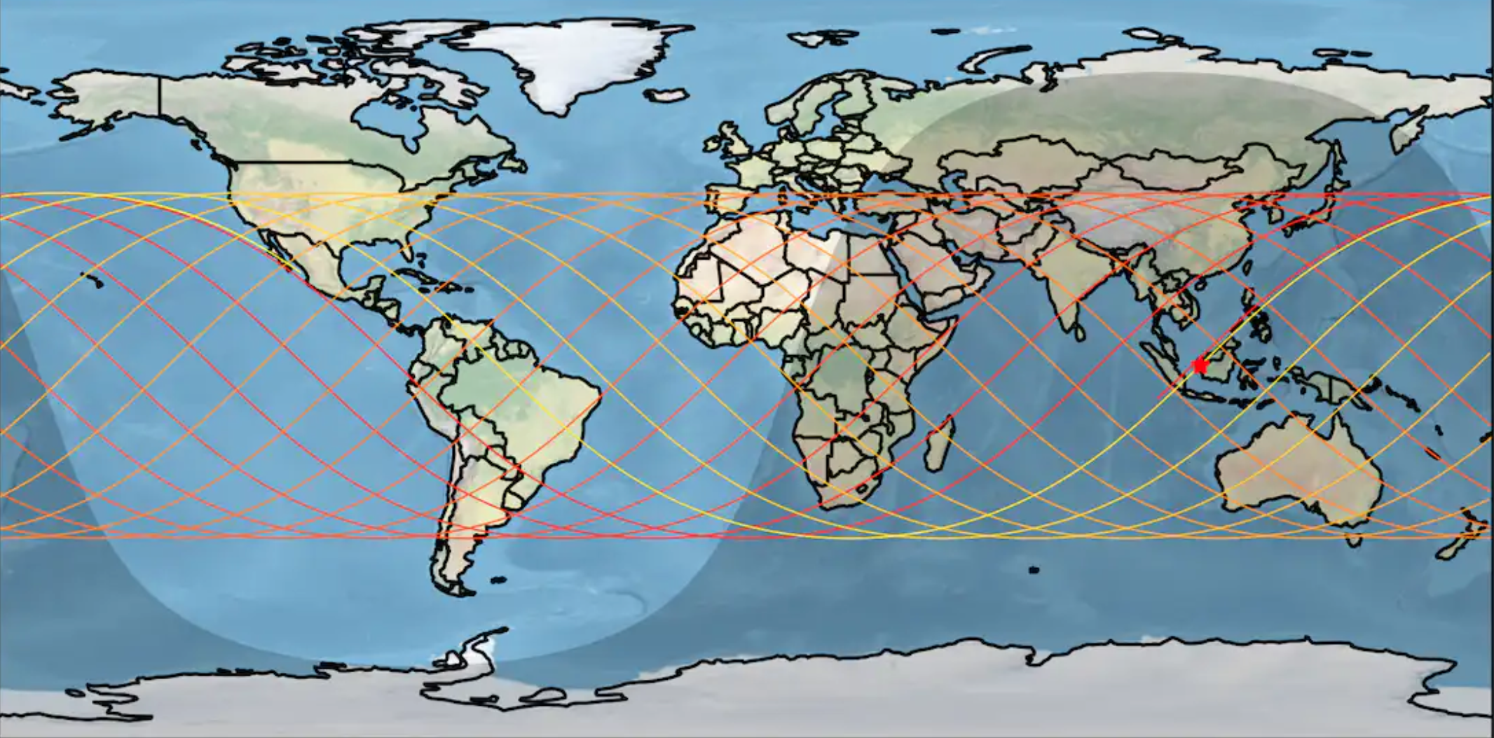 There are several factors behind these estimates, but let’s just focus on one key one for now. The image below shows the orbital path the recent Long March 5B-Y3 rocket followed for its final 24 hours (different objects take different orbital paths), as well as its re-entry location marked in red.