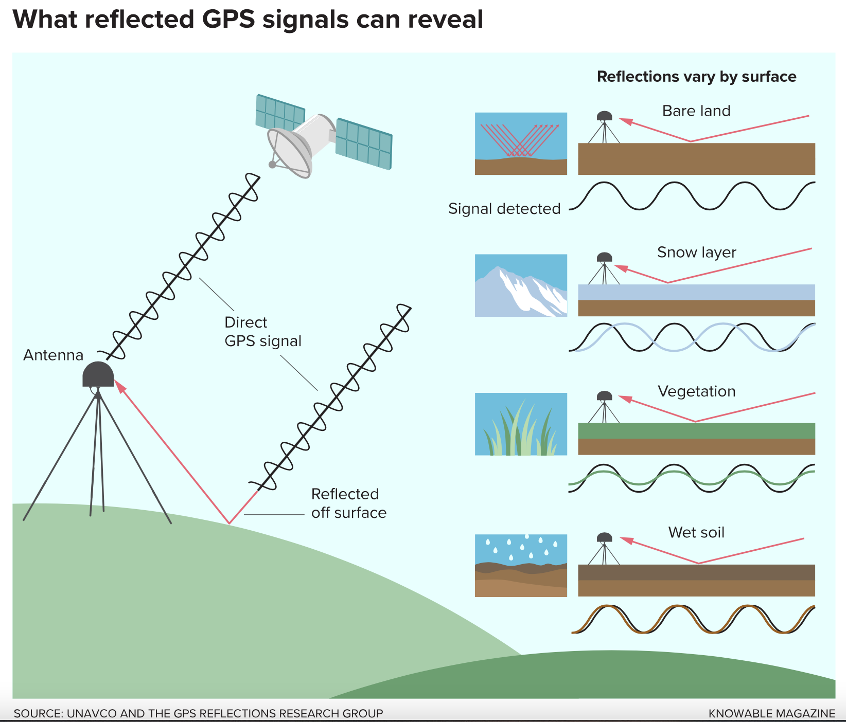 This approach allows scientists to learn about the ground beneath the GPS receiver — for instance how much moisture the soil contains or how much snow has accumulated on the surface. (The more snow falls on the ground, the shorter the distance between the echo and the receiver.) GPS stations can work as snow sensors to measure snow depth, such as in mountain areas where snowpack is a major water resource each year.