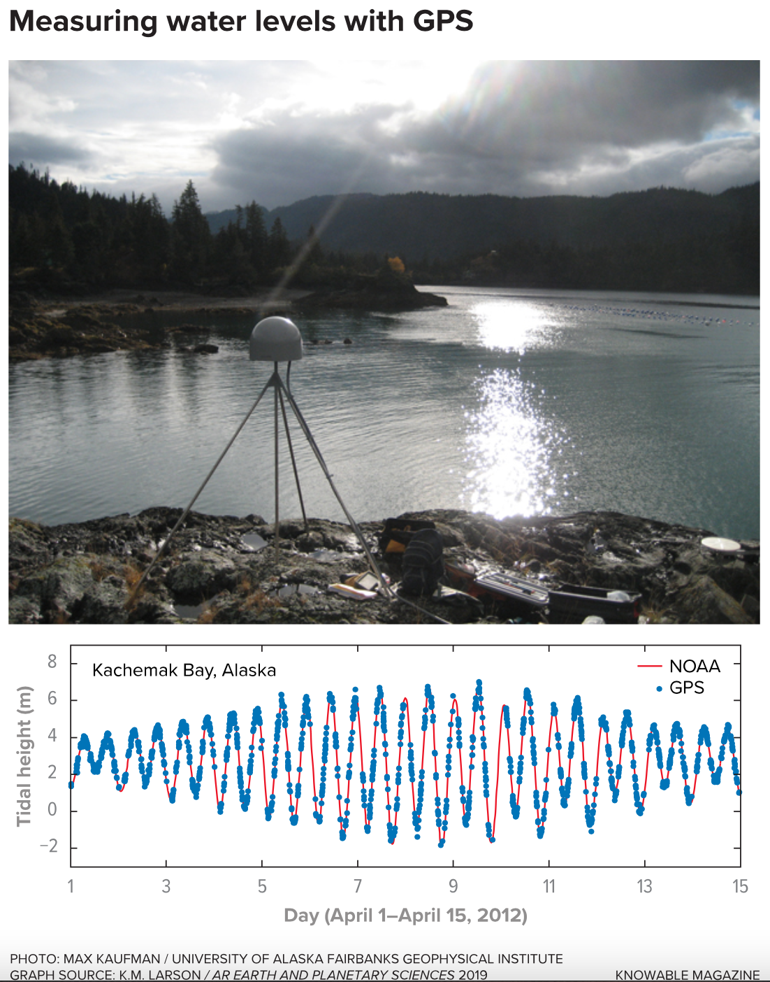 GPS receivers can even help oceanographers and mariners, by acting as tide gauges. Larson stumbled onto this while working with GPS data from Kachemak Bay, Alaska. The station was established to study tectonic deformation, but Larson was curious because the bay also has some of the biggest tidal variations in the United States. She looked at the GPS signals that were bouncing off the water and up to the receiver, and was able to track tidal changes almost as accurately as a real tide gauge in a nearby harbor.
