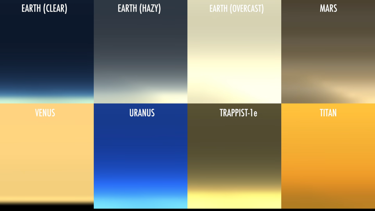 The simulations reveal sunsets that look quite different from those on Earth. On Uranus, for example, the sky morphs from a royal blue to a hazy brownish-yellow. Why the difference? The color of the sky on any planet is determined by the unique blend of molecules in the atmosphere. When incoming sunlight passes through the atmosphere, these molecules scatter light in specific ways, causing light of certain wavelengths to appear more visible to the human eye.