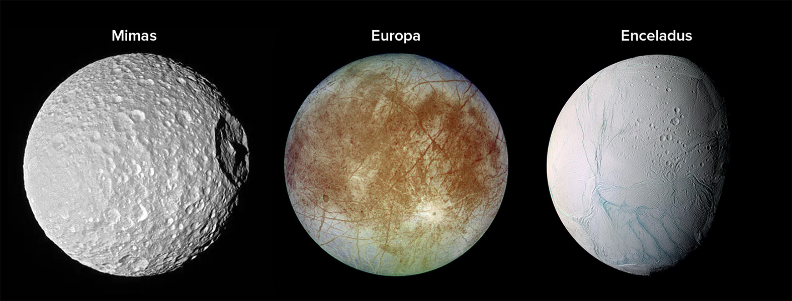 Mimas’ surface looks dramatically different from that of Jupiter’s moon Europa and another Saturnian moon, Enceladus. Both Europa and Enceladus are thought to harbor hidden oceans. (MIMAS, NASA/JPL-CALTECH/SPACE SCIENCE INSTITUTE. EUROPA, NASA/JPL-CALTECH/DLR. ENCELADUS, NASA/JPL/SPACE SCIENCE INSTITUTE)