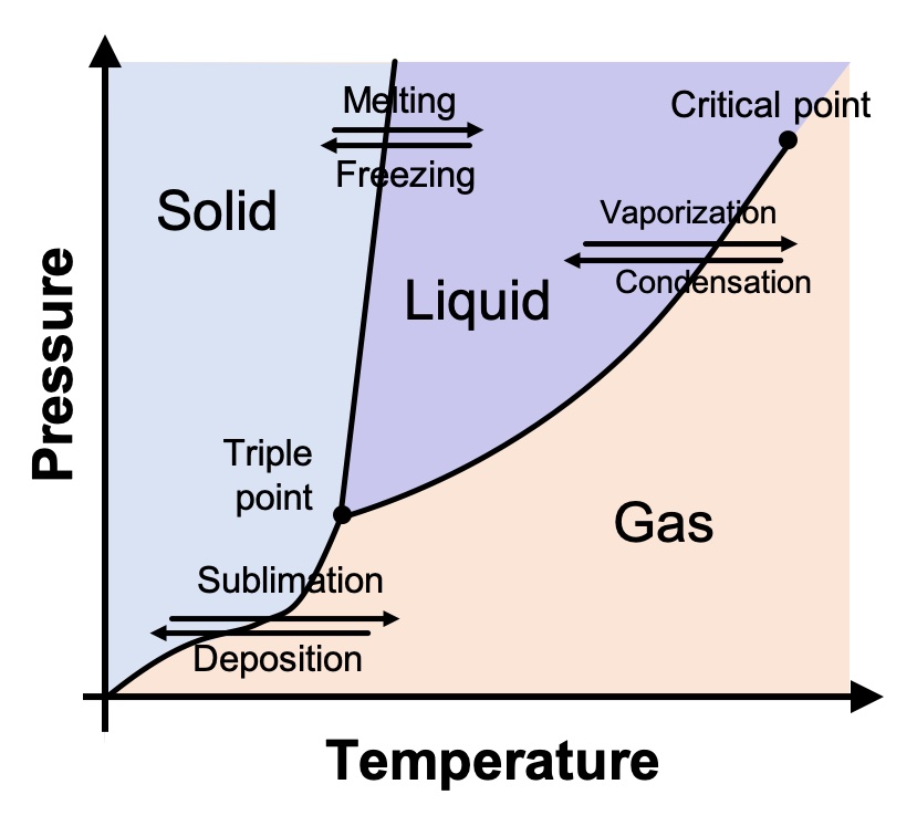 The physicists and chemists who study the various states of matter plot them on a chart known as a phase diagram. A generic one is shown below. On the Y-axis is pressure, and on the X-axis is temperature. The diagram shows what we all know intuitively to be true: As temperatures get colder, things tend to become solid; as the temperature increases, things tend to turn to liquid and eventually gas. This is true not just of water but of every substance.