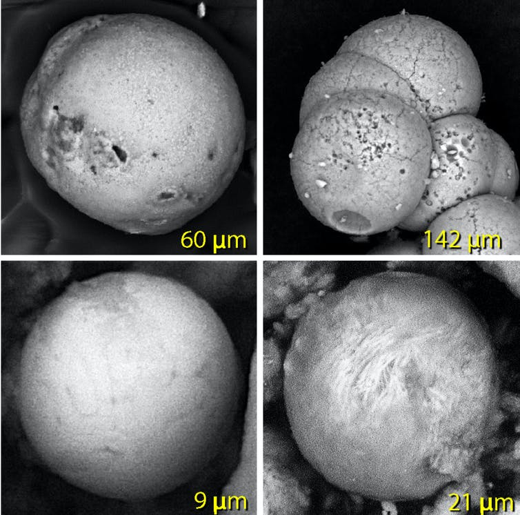 The destruction layer also contains tiny balls of melted material smaller than airborne dust particles. Called spherules, they are made of vaporized iron and sand that melted at about 2,900 F (1,590 C).