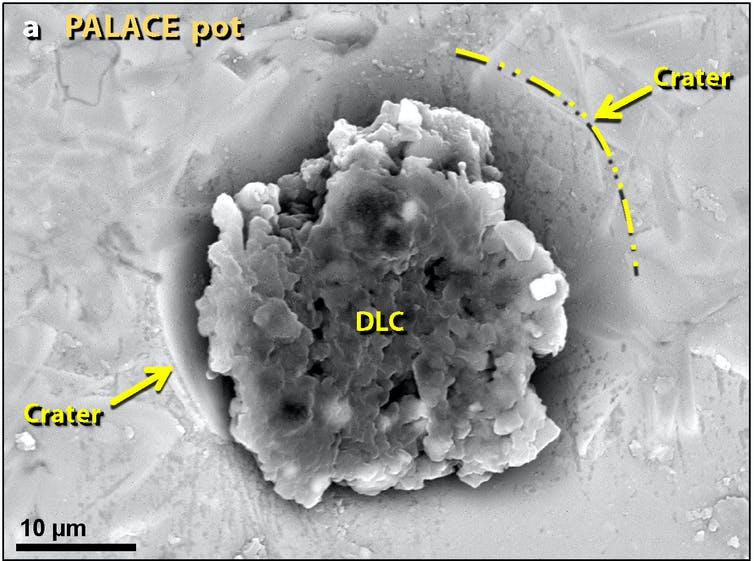 In addition, the surfaces of the pottery and meltglass are speckled with tiny melted metallic grains, including iridium with a melting point of 4,435 F (2,466 C), platinum that melts at 3,215 F (1,768 C) and zirconium silicate at 2,800 F (1,540 C).