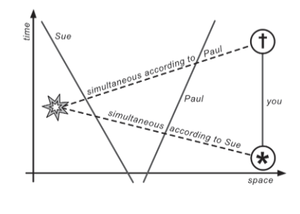 To illustrate the latter step, let us say the one event is your birth and the other event is a supernova explosion (see figure 3). The explosion is causally disconnected from your birth, which means the light from it hadn’t reached Earth at the time you were born. You can then imagine that your friend Sue, the space traveler, sees these events at the same time, so they happened simultaneously according to her.