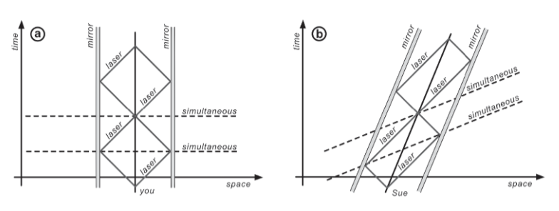 You would claim that Sue is making a mistake, but according to Sue, you are making the mistake because, to her, you are the one who is moving. She would say that actually your laser pulses do not hit your mirrors at the same time (figures 2c and 2d).