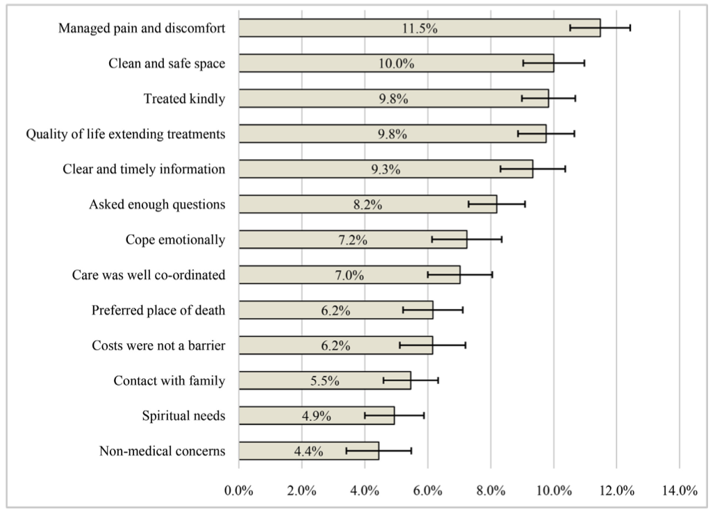 The researchers settled on 13 factors in total. They then surveyed 1,250 family caregivers across five different countries who had recently looked after a now-deceased loved one to ascertain the relative importance of each indicator. Here’s how the factors ranked:
