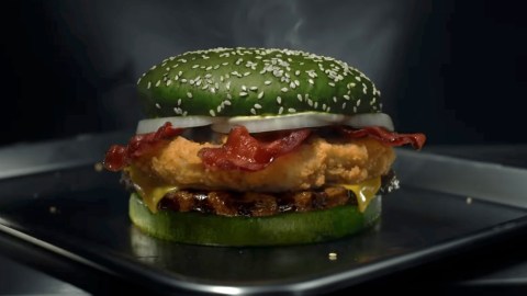 … this spooky sandwich features ¼ lb* of savory flame – grilled beef, a 100% white meat crispy chicken fillet, melted American cheese, thick cut bacon, creamy mayonnaise, and onions all assembled on a glazed green sesame seed bun.
