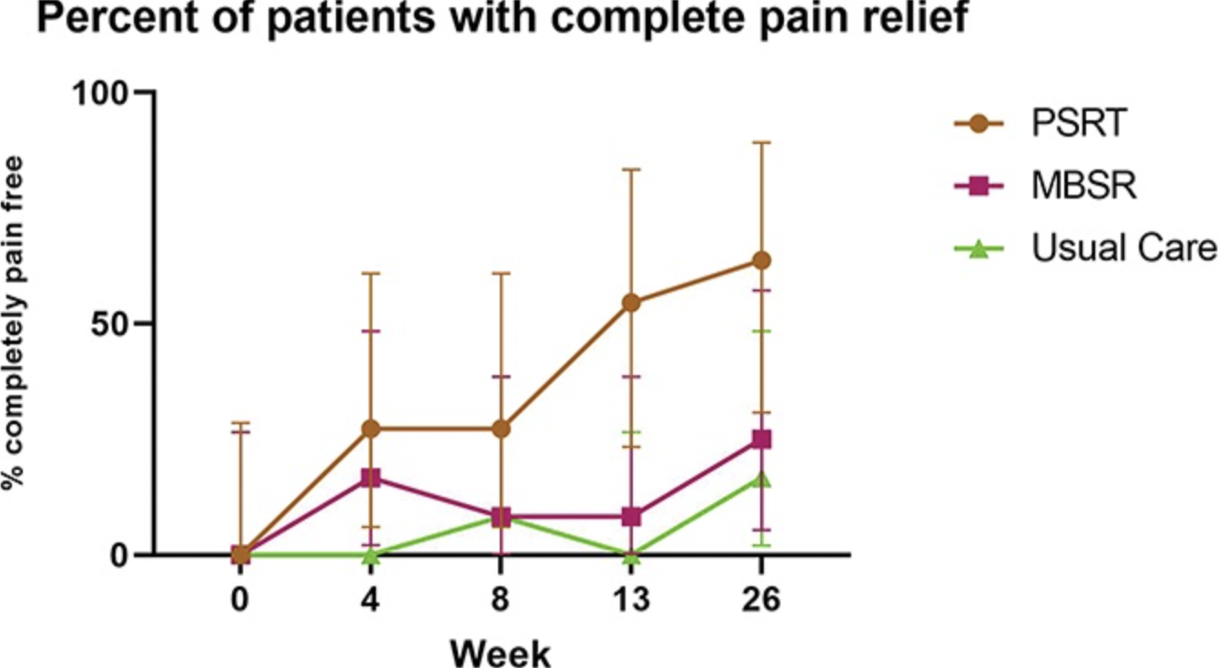 The PSRT group showed the greatest improvements by far. After four weeks, the PSRT participants reported an 83 percent reduction in pain disability, compared to 22 percent from the MSBR group and 11 percent from those who received usual care. In terms of pain bothersomeness, the PSRT group showed a 60 percent improvement, compared to 8 percent for MSBR and 18 percent for usual care.