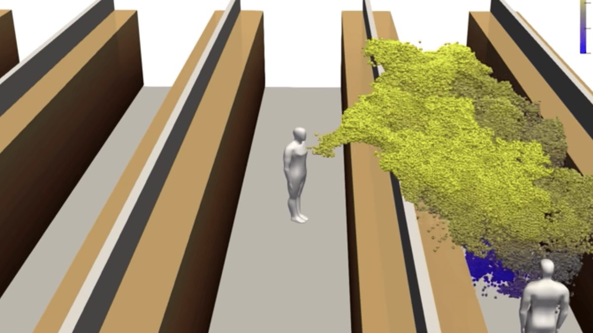 In the 3D simulation, a cloud of green particles originating from a person coughing in one aisle are shown spreading into the next aisle over. The cough releases a turbulent mist of droplets — aerosolized particles — which stay suspended in the air and move over into the parallel row.