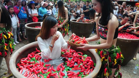 COVER PHOTO: This photo taken on July 2, 2016 shows contestants taking part in a chilli pepper-eating competition in Lijiang, southwest China’s Yunnan province. The first prize was won by a man from Chengdu as he ate 47 chilli peppers in two minutes. (Photo credit: STR/AFP/Getty Images)