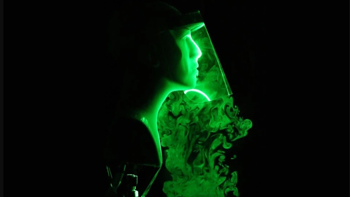 The authors attached a face shield to a slightly modified mannequin that could simulate coughing to demonstrate this. Small droplets of water and glycerin, comparable in size to the lower end of estimates of what is needed for a virus to travel, were blown through the mannequin’s mouth and highlighted with laser sheets as they traveled throughout the room.