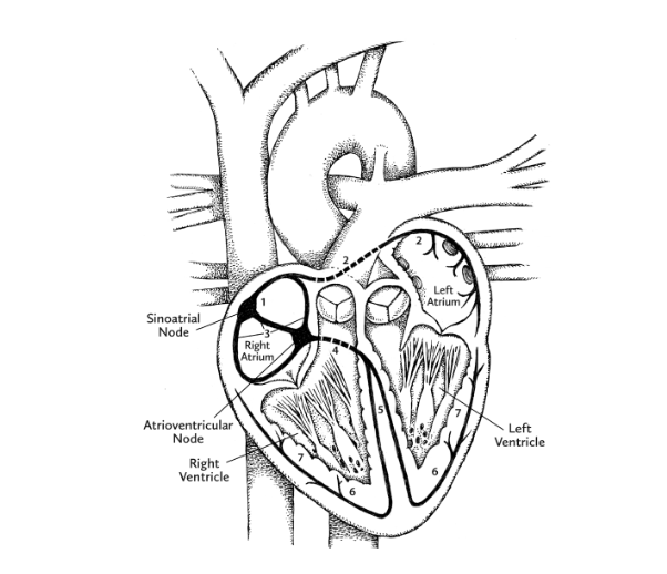 Meanwhile, thanks to pacemaker cells, human hearts have the ability to generate a continuous sequence of electrical signals. These begin at a location in the right atrium called the sinoatrial (SA) node, and speed through the heart along highly specific routes called conduction pathways. Moving like ripples of water after the splash of a pebble, the signals travel from the right atrium to the left atrium, both situated within the uppermost “base” of the heart. As the ripple begins to move downward toward the ventricles, another patch of pacemaker cells, called the atrioventricular (AV) node, slows down the signal, the slight lag time allowing the ventricles to fill with blood. The electrical signal from the AV node continues down toward the pointy apex of the heart. As it does, the muscles making up each ventricle are stimulated to contract in turn.