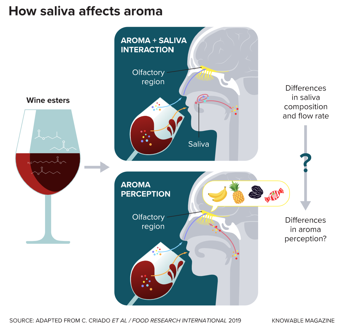 Saliva can also affect the aromas — which are responsible for the vast majority of our perception of flavor — that arise from food in the mouth. As we chew, some flavor molecules in the food dissolve in the saliva, but those that don’t can waft up into the nasal cavity to be sensed by the myriad receptors there. As a result, people with different salivary flow rates, or different saliva composition — especially of proteins called mucins — may have very different flavor experiences from the same food or beverage.