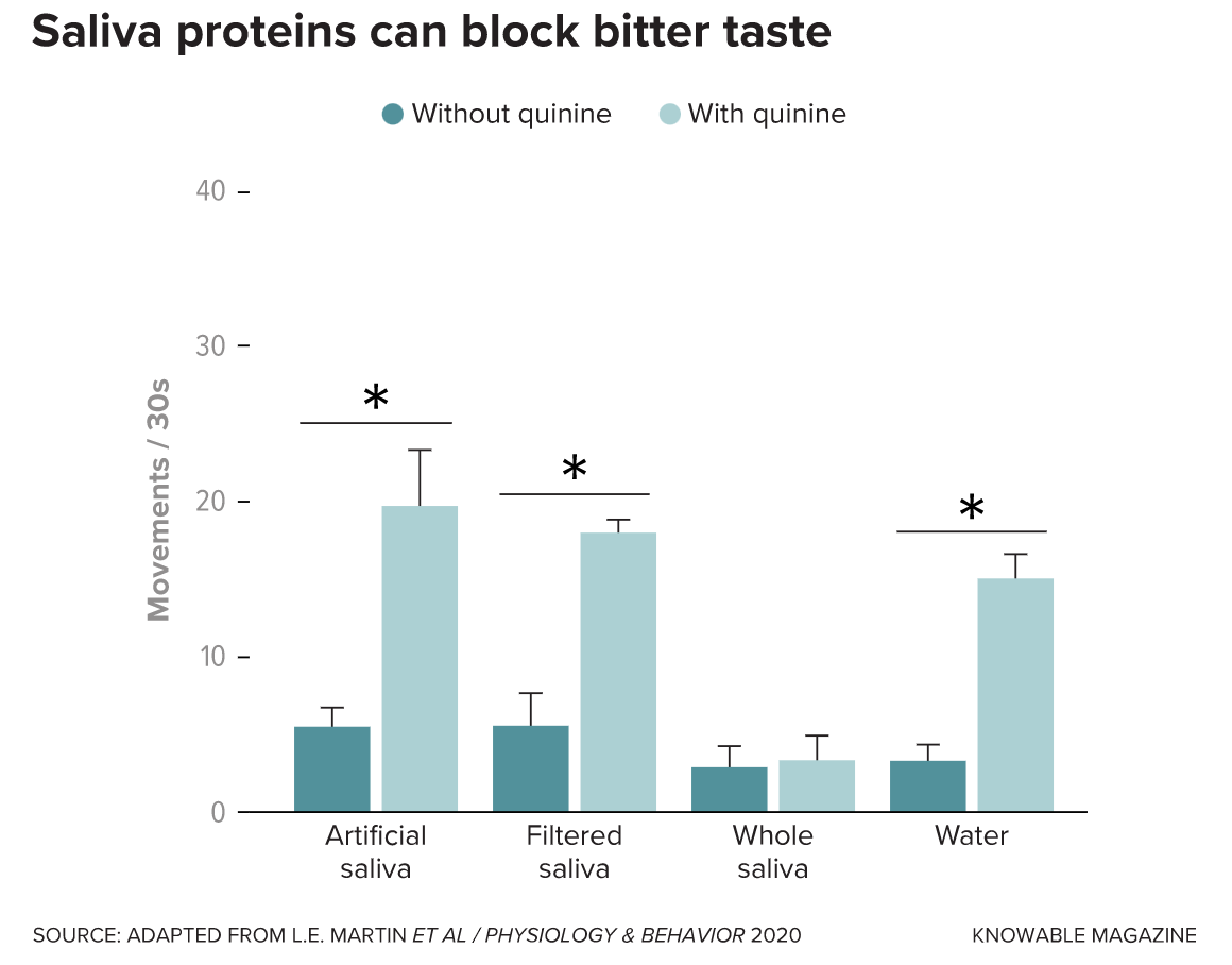 The makeup of saliva varies from person to person — and that depends partly on an individual’s past food choices, says Ann-Marie Torregrossa, a behavioral neuroscientist at the University at Buffalo. When Torregrossa fed rats diets containing bitter-tasting additives, she observed noticeable increases in multiple categories of saliva proteins. As those changes happened, rats became more likely to accept the bitterness in their food. “The way we think about this is, if you eat broccoli all the time, broccoli doesn’t taste bad to you,” says Torregrossa.