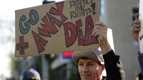 WEST HOLLYWOOD, CA - JANUARY 18: Protesters demonstrate the day after Drug Enforcement Administration (DEA) raids shut down 11 medical marijuana clinics around Los Angeles County on January 18, 2007 in West Hollywood, California. (Photo by David McNew/Getty Images)