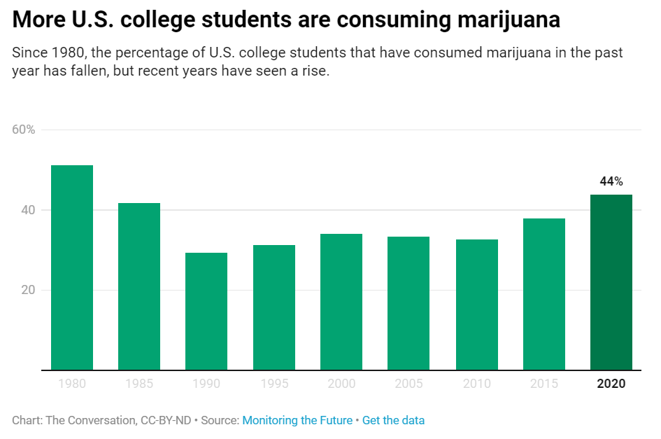 With 18 states legalizing cannabis for non-medical or “recreational” purposes – the first of which did so in 2012 – access to marijuana has increased, especially for college students over 21 years of age. While the past three reports from Monitoring the Future – a national drug use survey conducted annually by the University of Michigan – have shown that between 43% and 44% of college students report any cannabis use in the past year, over half of college students do not report use. This is important to note because research has shown that when people think “everyone” is doing something, they are more likely to start doing it themselves or do it more.