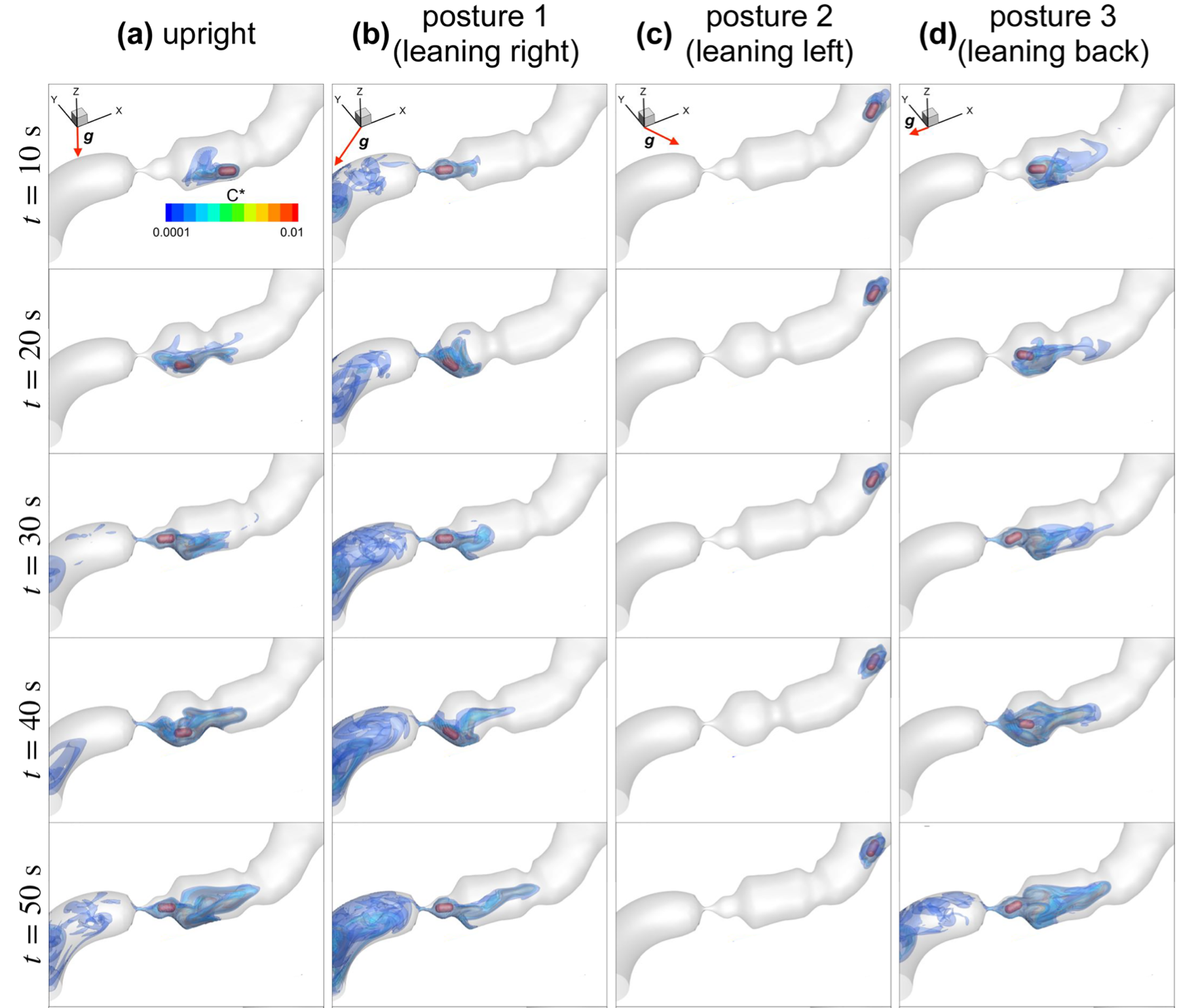 The researchers built a sophisticated computer simulation of the stomach, which they called StomachSim, to model what happens to a pill when the consumer is in one of the four postures. StomachSim takes into account the biomechanics, fluid dynamics, and anatomy of the stomach, among other variables. In the simulation, swallowed medications began releasing their contents into the duodenum the quickest under the “leaning right” scenario.