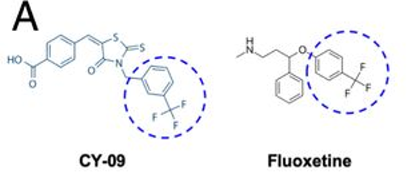 When the research team began their hunt for a drug to repurpose, they did not examine every FDA approved drug (which number about 1,300). Instead, they looked for approved drugs that were structurally similar to a specific small molecule, CY-09, which prevents the danger alarm from sounding. They found that CY-09 and fluoxetine share a molecular structure: a (trifluoromethyl)phenyl branch.