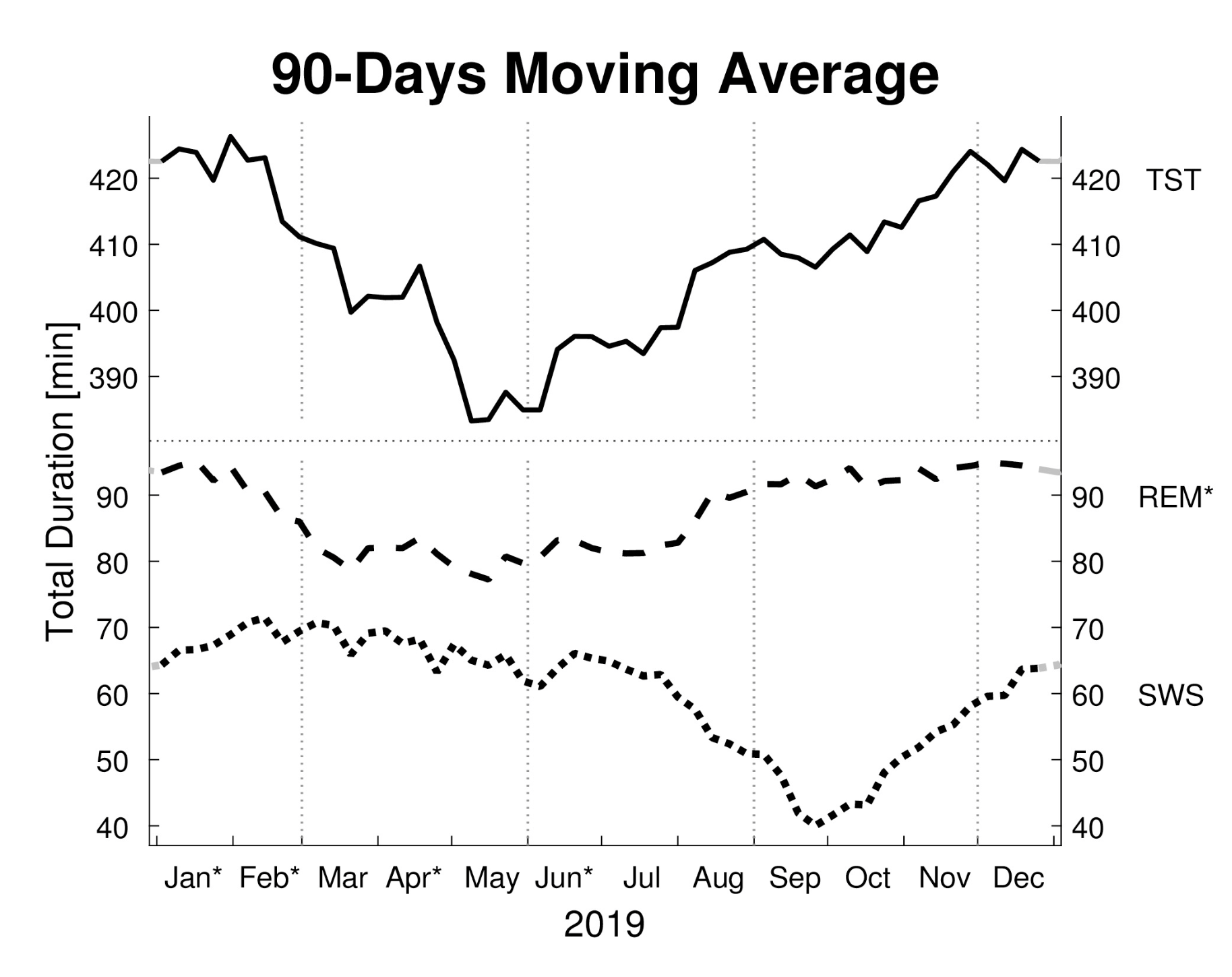 As the monthly data revealed, subjects tended to sleep longer during the winter, by up to 60 minutes (though the result barely missed statistical significance); they took about 25 minutes shorter to enter into REM sleep during autumn than spring; they experienced about 30 minutes more REM sleep on average in winter than spring; and they underwent a swift and sudden drop in slow-wave sleep (the deepest form of NREM sleep, during which we dream and our memories consolidate) in the fall months.