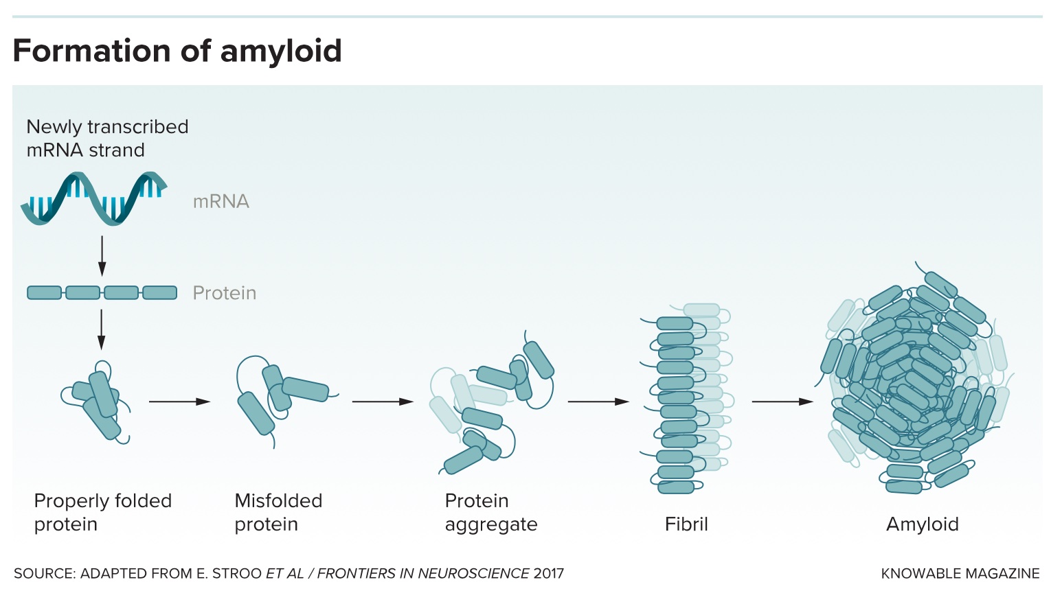 There are a few dozen human proteins that have a propensity to form amyloid, and scientists regularly add more to the list, says Fabrizio Chiti, a biochemist at the University of Florence, Italy, who coauthored a paper on misfolded proteins in disease for the Annual Review of Biochemistry. The body does have ways to identify and dispose of these misfolded proteins, but with age, these defenses tend to falter, so amyloid diseases often strike older people.