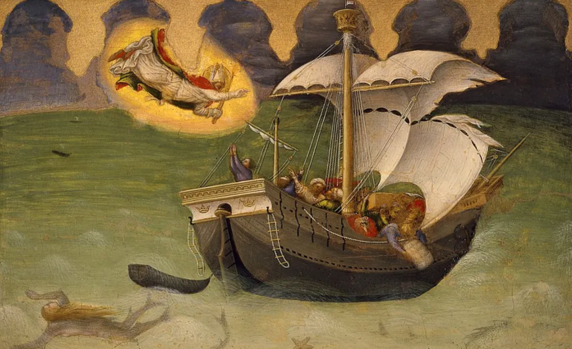 Suddenly appearing to save people became a favourite trick in accounts of the saint’s life and in folklore. He once saved three innocents from execution, teleporting behind the executioner and grabbing his sword, before upbraiding the judges for taking bribes.