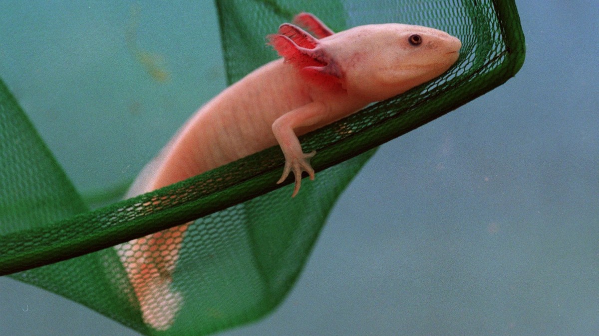 In its most common form, which scientists call the white mutant, the axolotl resembles what the translucid foetus of a cross between an otter and a shortfin eel might look like. On the internet, it is celebrated for its anthropoid smile; in Mexico, where the Aztecs once hailed as it as a godly incarnation, it is an insult to say that someone looks like one. Behind its blunt and flattened head extends a distended torso resolving into a long, ichthyic tail. The axolotl can grow to nearly a foot in length; four tiny legs dangle off its body like evolutionary afterthoughts. It wears a collar of what seem to be red feathers behind each cheek, and these ciliated gill stalks float and tremble and gently splay in the water, like the plumage in a burlesque fan. They grow back if you cut them off, too. Precisely how the animal accomplishes this, or any of its feats of regrowth, is not well understood.