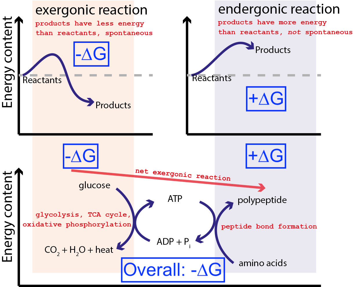 The above figure shows a very typical series of chemical reactions in a cell. A cell can extract free energy from glucose (-∆G) to produce an intermediate and highly energetic molecule (called ATP) that drives protein synthesis, which requires an input of free energy (+∆G). Because the overall process has a net release of free energy (-∆G), the reaction can proceed.