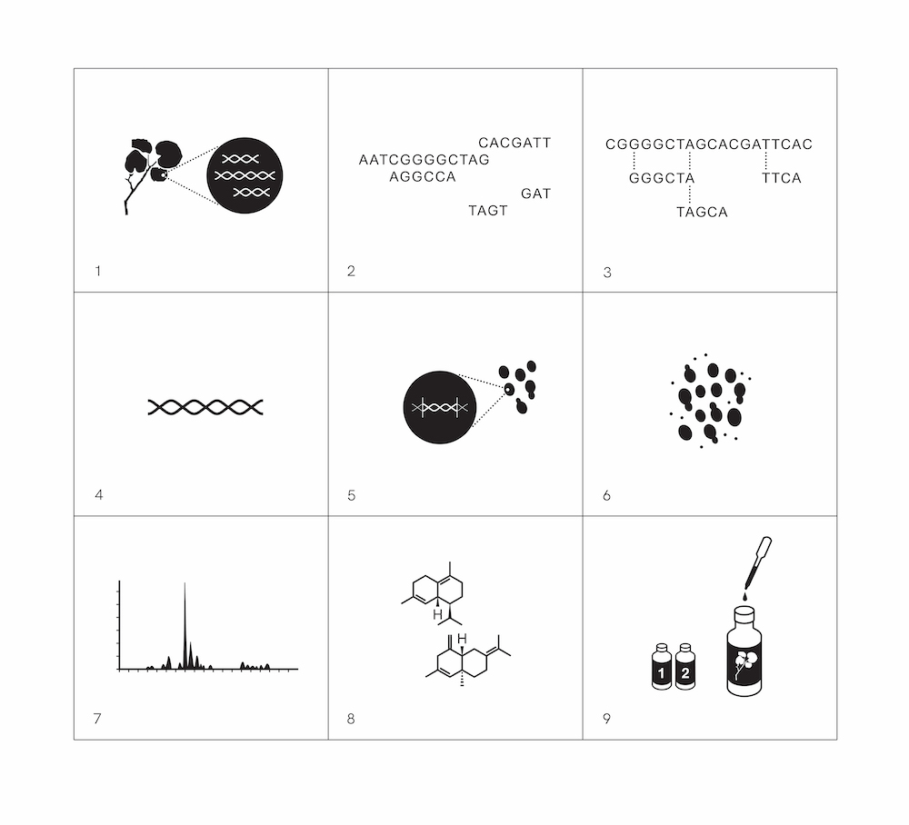 Revealing the flowers’ smells from the information encoded in their DNA first required help from paleogenomics experts at the University of California at Santa Cruz, who could extract DNA from the degraded historic samples. Ginkgo’s scientists and engineers then analyzed the fragments to predict gene sequences that might encode fragrance-producing enzymes. They compared the DNA with known sequences from other organisms and filled in any gaps using the template genes (fig. 14.8).