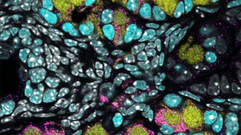 A false color image of the results of the study. Immature human eggs are shown in pink. (Courtesy of Saitou Lab)