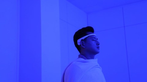 TORONTO, ON- Kevin Kwok demonstrates meditation techniques in a meditation pod at Mindset Gym. Sean Finnell led Kevin through a five minute meditation for photos. (Rene Johnston/Toronto Star via Getty Images)