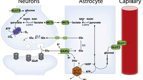 Surprisingly, the neurons responsible for these complicated functions are not sugar addicts; the cells that support them, called astrocytes, are. Astrocytes are particularly well-equipped to snatch up glucose and metabolize it through a process called glycolysis. This process is relatively slow and doesn’t yield much energy. It does, however, convert the six-carbon sugar into a three-carbon molecule called lactate, which is the fuel of choice for neurons. Neurons then take up lactate, convert it into a different molecule (pyruvate), and rush it to the mitochondria. In that powerhouse, a metabolic process called oxidative phosphorylation uses oxygen to yield a tremendous amount of energy.