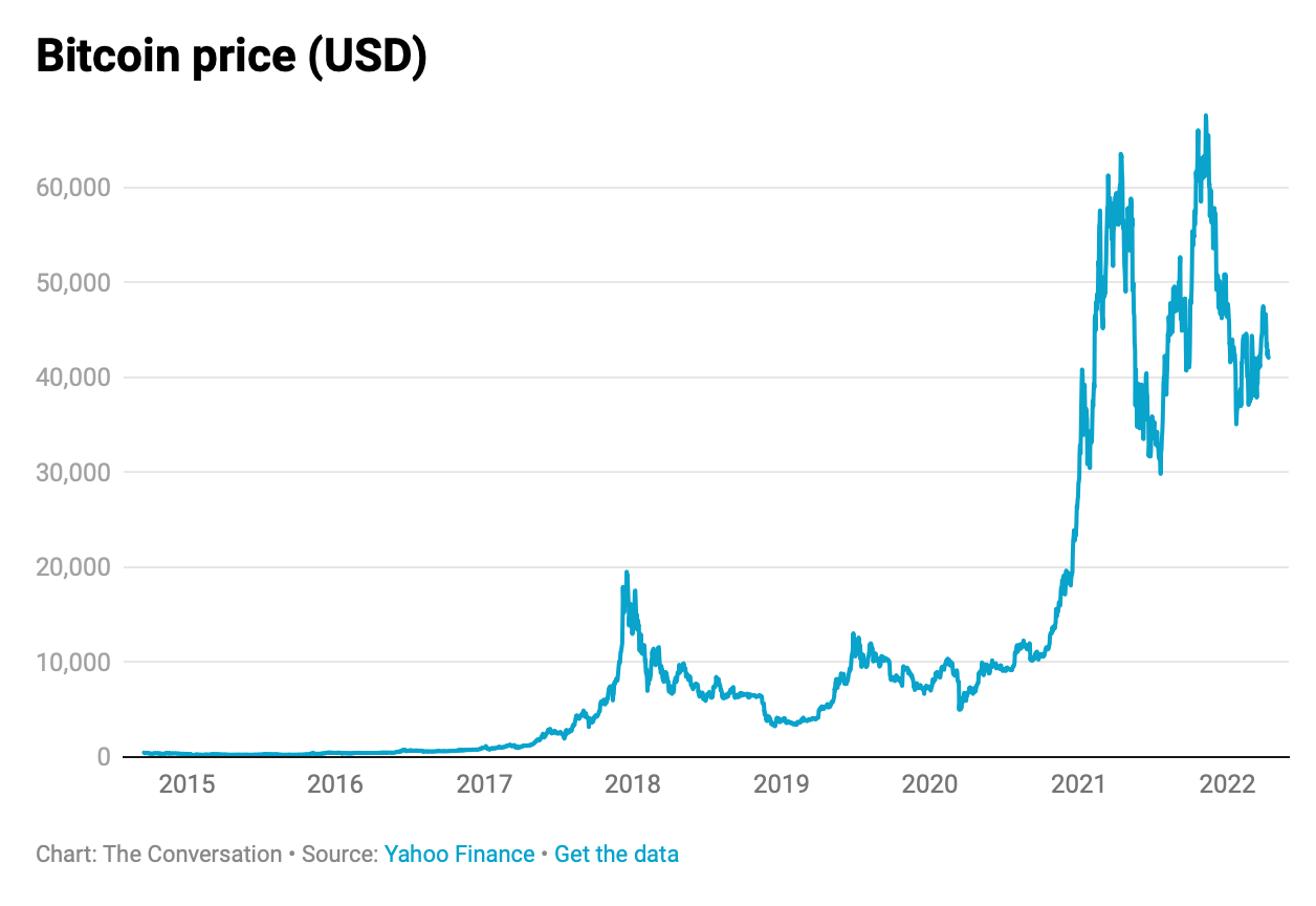 Since the invention of Bitcoin in 2009 the global cryptocurrency market has grown from nothing to a value of around US$2 trillion. From a price of US$1 in 2011, Bitcoin rose to an all-time high of more than US$63,000 in April 2021, and now hovers around the US$42,000 mark.