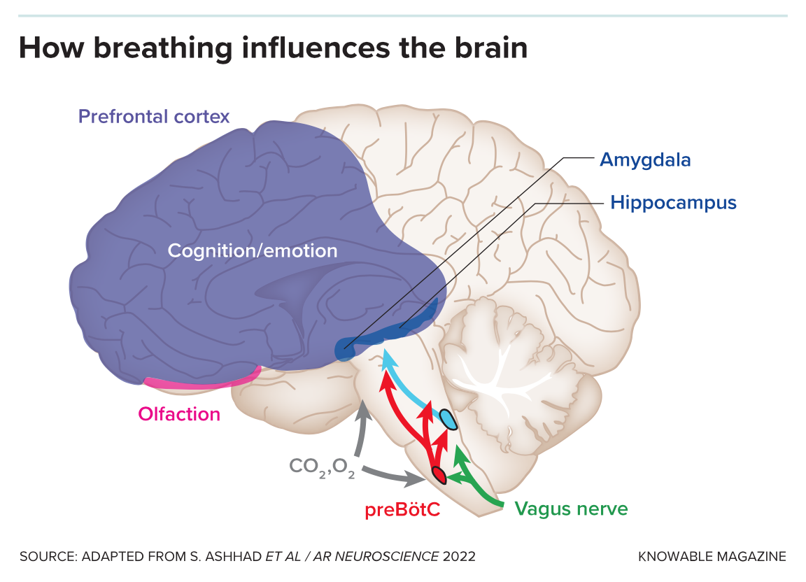 Around the same time, neuroscientist Christina Zelano and colleagues reported similar findings in humans. Using data from electrodes placed by surgeons on the brains of epilepsy patients to monitor their seizures, the researchers found that natural breathing synchronizes oscillations within several brain regions, including the hippocampus and the amygdala, an important player in emotional processing. This synchronizing effect diminished when the researchers asked subjects to breathe through their mouth, suggesting that sensory feedback from nasal airflow plays a key role.