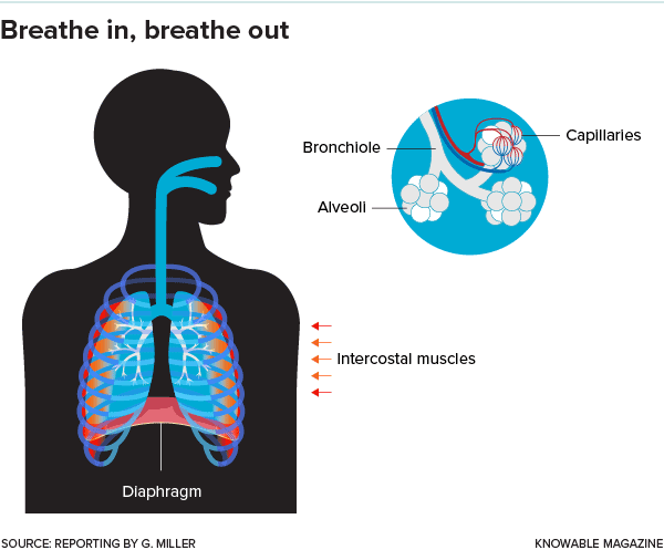 But the lungs can’t do it alone. They’re essentially limp sacks of tissue. “In order for this to work, the lungs have to be pumped like a bellows,” Feldman says. And they are — with each inhalation, the diaphragm muscle at the bottom of the chest cavity contracts, moving downward about half an inch. At the same time, the intercostal muscles between the ribs move the rib cage up and out — all of which expands the lungs and draws in air. (If you’ve ever had the wind knocked out of you by a blow to the stomach, you know all about the diaphragm; and if you’ve eaten barbecued ribs, you have encountered intercostal muscles.)