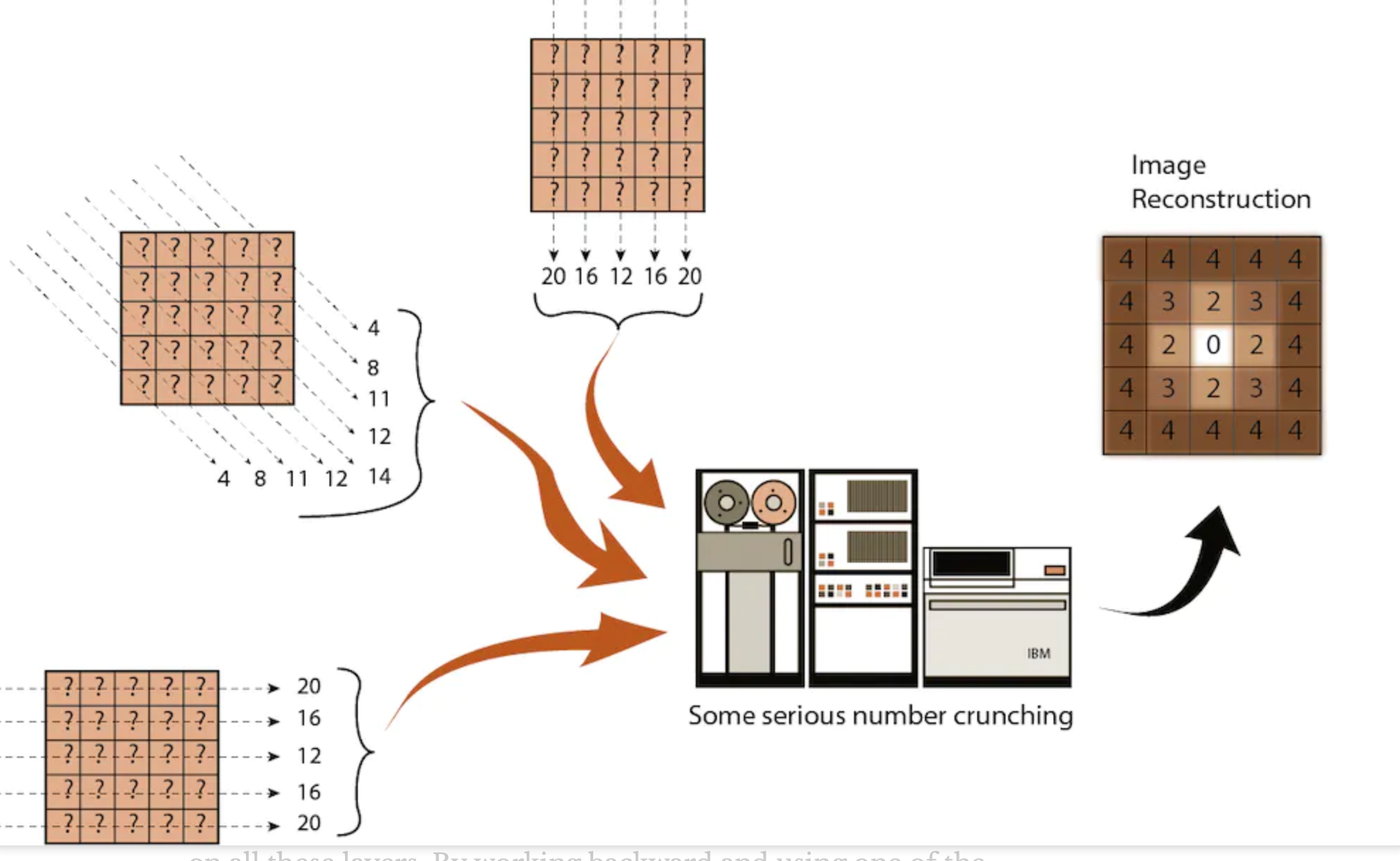 Finally, in possibly his most ingenious invention, Hounsfield created an algorithm to reconstruct an image of the brain based on all these layers. By working backward and using one of the era’s fastest new computers, he could calculate the value for each little box of each brain layer. Eureka!