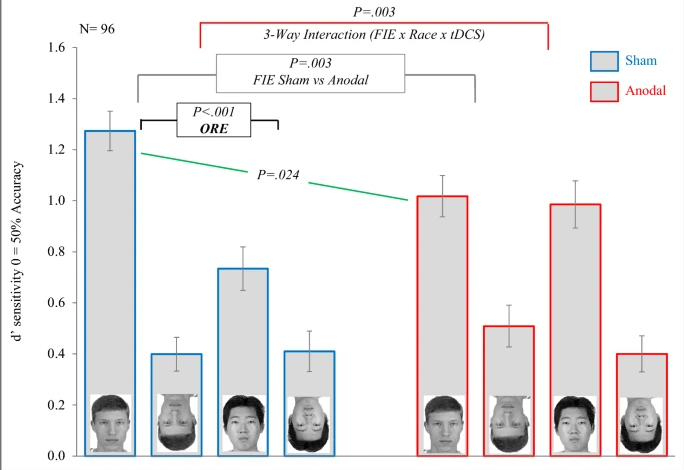 As expected, the unstimulated control group showed a face inversion effect for own-race faces that was almost three times larger than the one for other-race faces. This was because the subjects were almost twice as likely to recognize own-race faces in the upright orientation compared to other-race faces. The subjects who received tDCS, however, showed no difference in face inversion effect for own- versus other-race faces, supporting the hypothesis that people use previously learned pattern configurations to distinguish between individual faces. Essentially, the tDCS made the same-race faces look alike.