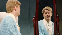 A woman with blonde hair and earrings, wearing a dark, pinstriped top with a microphone clipped to it, speaking against a plain background.