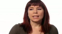 Woman with straight brown hair wearing a black blazer and white top, looking at the camera with a neutral expression against a plain light background.