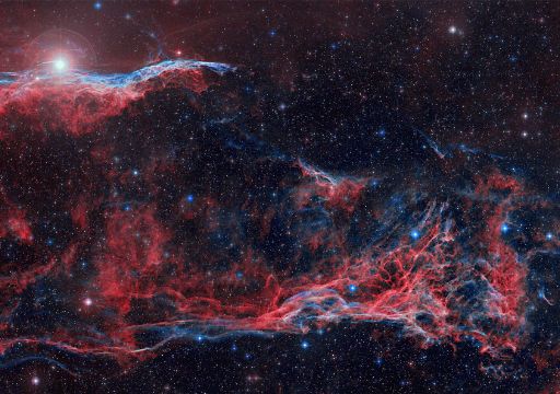 These red waves of glowing gas arch toward the constellation of Cygnus. They can be found in the western part of the Veil Nebula, the remnant of a large supernova […]