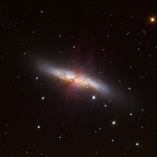 The light from an exploding star in the Messier 82 (aka "Cigar") galaxy was first photographed from Earth on January 22nd, 2013.