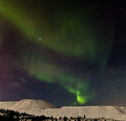 The auroras appear mostly green, as high energy particles hitting the Earth's atmosphere cause the air to glow as electrons resettle into their oxygen hosts.
